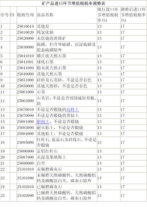 經(jīng)國務院批準,2009年實行增值稅轉(zhuǎn)型改革,并調(diào)整礦產(chǎn)品增值稅稅率。礦產(chǎn)品進口環(huán)節(jié)增值稅稅率進行相應調(diào)整,自2009年1月1日起,附件所列稅目礦產(chǎn)品的進口環(huán)節(jié)增值稅稅率由13%提高到17%。