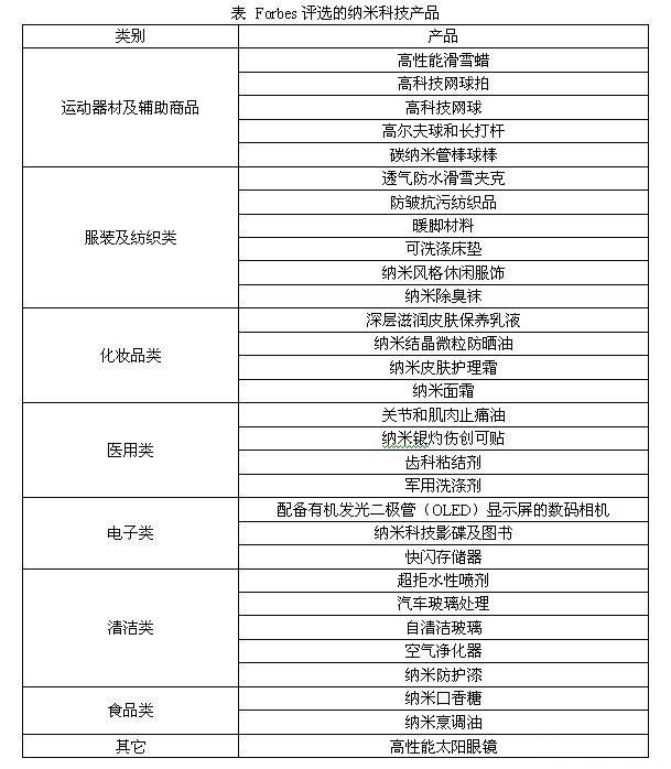 著名商業(yè)經(jīng)濟(jì)雜志“Forbes”已連續(xù)三年對全球納米科技產(chǎn)品分別進(jìn)行了評選(見下表),通過選出的這30項(xiàng)納米產(chǎn)品,初步可看出目前全球市場較為成熟的納米技術(shù)產(chǎn)品,以及未來幾年可能最為活躍的納米產(chǎn)品領(lǐng)域,以幫助廣大消費(fèi)者鑒別真?zhèn)巍凹{米產(chǎn)品”。