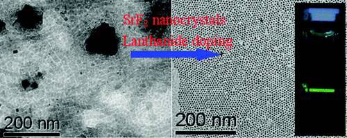 稀土摻雜前后SrF2納米晶的TEM像和Re: SrF2的上轉(zhuǎn)換發(fā)光照片
