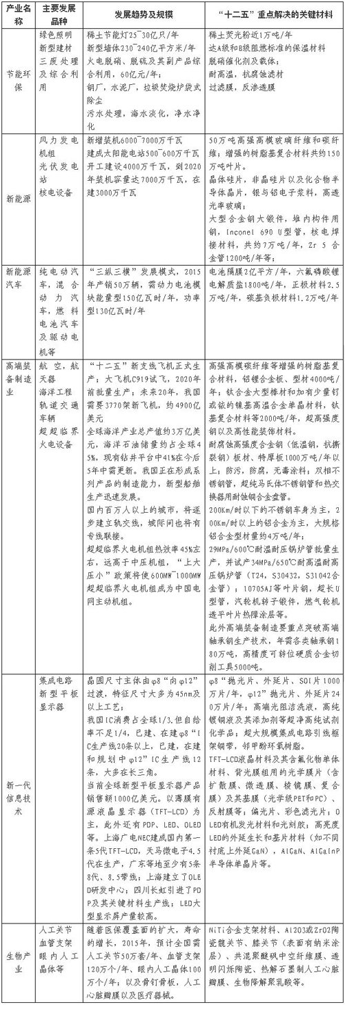 上海市新材料產(chǎn)業(yè)要以加強(qiáng)對(duì)接、提高能級(jí)為重點(diǎn),加快實(shí)現(xiàn)傳統(tǒng)材料性能的升級(jí),實(shí)現(xiàn)高品質(zhì)基礎(chǔ)材料生產(chǎn)能耗的大幅度降低。瞄準(zhǔn)國家戰(zhàn)略性新興產(chǎn)業(yè)和本市先進(jìn)制造業(yè)需求,大力發(fā)展高性能精品鋼、高性能碳纖維、耐高溫纖維、高溫合金、鈦合金、生物相容材料、環(huán)保節(jié)能材料、稀土材料等。要繼續(xù)促進(jìn)高端金屬結(jié)構(gòu)材料的發(fā)展,加快改造優(yōu)化提升鋼鐵產(chǎn)業(yè),提高精品鋼比例;要重視先進(jìn)高分子材料產(chǎn)業(yè)鏈的建設(shè),建立完整的石油化工及其后續(xù)產(chǎn)品和精細(xì)化工產(chǎn)品的產(chǎn)業(yè)體系;加快新型無機(jī)非金屬材料和高性能復(fù)合材料研究成果的產(chǎn)業(yè)化進(jìn)程。