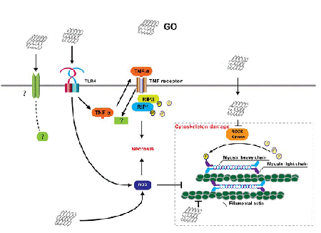 研究人員發(fā)現(xiàn),GO可通過(guò)激活TLR4受體誘發(fā)細(xì)胞腫瘤壞死因子(TNF-α)的自分泌。TNF-α可作用于其細(xì)胞膜表面的TNF-α受體,使其下游的受體相互作用蛋白1(RIP1)和3(RIP3)磷酸化,進(jìn)一步誘導(dǎo)細(xì)胞的程序性壞死。在此過(guò)程中,GO所誘導(dǎo)的活性氧(ROS)也促進(jìn)了細(xì)胞的壞死過(guò)程。同時(shí),GO可在巨噬細(xì)胞內(nèi)大量累積,這可引發(fā)細(xì)胞骨架的塌陷和吞噬能力的抑制。Rho相關(guān)激酶(ROCK)在骨架動(dòng)態(tài)平衡中起重要作用。而GO對(duì)細(xì)胞骨架的影響是通過(guò)抑制該激酶的活性實(shí)現(xiàn)的。這項(xiàng)研究工作對(duì)于揭示氧化石墨烯誘發(fā)的細(xì)胞死亡機(jī)制具有重要意義。