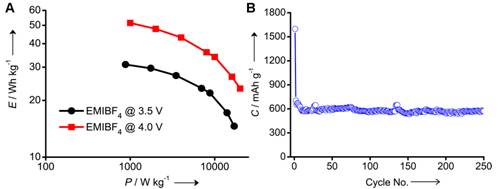 圖2(A)石墨烯基對稱型超級電容器在離子液體電解液下的能量密度和功率密度關(guān)系曲線;(B)石墨烯作為鋰離子電池負(fù)極材料的循環(huán)壽命