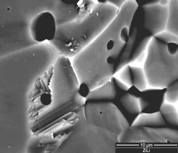 圖中給出了浙江自立股份有限公司生產的板狀剛玉的顯微結構圖。可以看出:低倍下剛玉晶粒大小在50~200μm左右,晶內含有大量微米級氣孔,晶粒延臺階狀生長,使板狀剛玉具有優(yōu)異的熱震穩(wěn)定性,從而在耐火材料行業(yè)大規(guī)模應用。