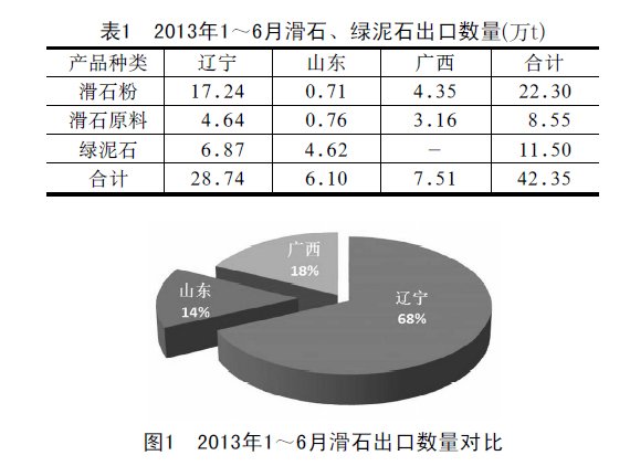 2013年1~6月中國滑石、綠泥石產(chǎn)量約80~90萬t。出口情況如表1、圖1所示。由表1可知,出口總計42.35萬t,其中粉體22.3萬t,原料8.55萬t,綠泥石11.5萬t。由圖1可見,三個出口主產(chǎn)地的數(shù)量遼寧最大,占68%,28.74萬t;廣西18%,7.51萬t;山東14%,6.1萬t。