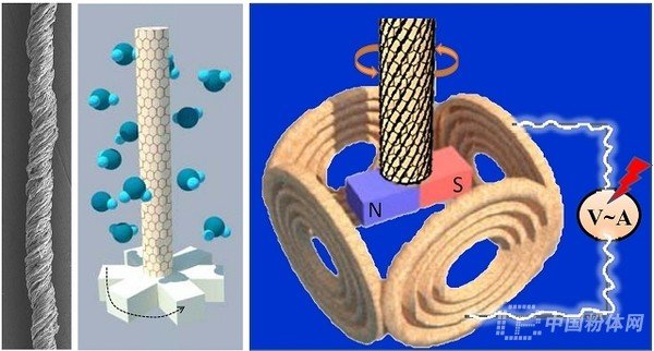 圖示:螺旋石墨烯纖維在濕度改變下帶動磁鐵旋轉產(chǎn)生電能