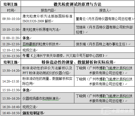 為了滿足顆粒粉體行業(yè)對顆粒測試與表征技術(shù)的需求,搭建企業(yè)與用戶的互動(dòng)交流平臺,為儀器用戶提供顆粒測試與表征技術(shù)原理、儀器實(shí)踐操作的培訓(xùn)。中國顆粒學(xué)會、丹東百特儀器有限公司和廣州博勒飛粘度計(jì)質(zhì)構(gòu)儀技術(shù)服務(wù)有限公司擬定于2014年10月15日在上海國際展覽中心舉辦“2014年顆粒測試與表征技術(shù)培訓(xùn)班”,同期“2014 中國國際粉體加工/散料輸送展覽會”和“2014 粉體行業(yè)熱點(diǎn)及應(yīng)用技術(shù)研討會”將于2014 年10 月14-16 日舉辦。有關(guān)培訓(xùn)班詳情如下: