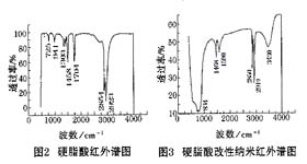 從圖2可以發(fā)現(xiàn),游離羧基(—COOH)中的伸縮振動(dòng)吸收峰在1725—1700cm-1處,而在圖3中并未出現(xiàn),因此可以證明硬脂酸對(duì)納米粒子的表面改性為化學(xué)改性,而不是單純的表面物理吸附改性。