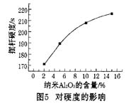 如圖5,涂膜的硬度隨著納米AI2O3添加量的增加而變大,添加2%的納米AI2O3擺桿硬度為171 s,添加15%擺桿硬度達(dá)到217 s。