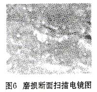 圖6為磨損斷面內(nèi)部的掃描電鏡圖,白點(diǎn)為樹(shù)脂被磨去后裸露出的納米AI2O3粒子的形貌。從圖6可以看出納米粒子在樹(shù)脂中的分散大部分在20~100nm之間,說(shuō)明納米AI2O3在樹(shù)脂中分散良好;大部分納米粒子與樹(shù)脂結(jié)合的界面處較為模糊,說(shuō)明表面處理過(guò)的納米粒子與樹(shù)脂具有較好的相容性。磨輪上磨料粒子為堅(jiān)硬的石英砂,樹(shù)脂基體由于相對(duì)較軟,易被磨料的粒子嵌入,隨著磨輪的轉(zhuǎn)動(dòng),樹(shù)脂基體首先被磨掉,使納米粒子裸露出來(lái),突出的堅(jiān)硬的納米AI2O3粒子在其中起著阻礙磨料繼續(xù)深入磨損涂層的作用。