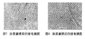 圖7和圖8為納米復(fù)合涂層磨損前后的掃描電鏡形貌圖。從圖7中可以看出由于納米AI2O3的加入,涂層具有較為致密的表面結(jié)構(gòu),從一定程度上增加了表面的硬度,表面平整且光潔,減少了由于黏著磨損所引起的磨損損耗。從圖8中可以看出在磨損表面排列著連續(xù)分布的犁溝,這是因?yàn)锳I2O3粒子具有高硬度和高強(qiáng)度,在磨損過(guò)程中脫落下來(lái)后,有可能滯留在對(duì)磨面間,起到磨粒的作用,在磨損表面上形成了劃痕。因此添加過(guò)量的納米粒子會(huì)促使磨料磨損的發(fā)生,加快涂膜的磨損。