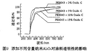 如圖9所示,在聚酯涂料中,隨著納米AI2O3含量的增加,涂膜的光學(xué)透過(guò)率一般會(huì)有所降低,尤其加入15%的納米AI2O3后,可見(jiàn)光透過(guò)率為80%左右,如果繼續(xù)增大納米AI2O3的含量,會(huì)導(dǎo)致涂料的透明性較差。另外還可以看出,在紫外光波段隨著納米AI2O3添加量的增加,涂膜對(duì)紫外光的屏蔽性能也在增強(qiáng),這說(shuō)明納米A12O3也具有一定的紫外線屏蔽能力.