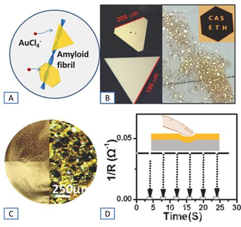 圖. A) 利用氯金酸和淀粉樣納米纖絲合成二維金單晶的示意圖;B)二維金單晶的光學顯微鏡照片;C)二維金單晶/聚氨酯復合膜的正面(左上)、背面(左下)及光學顯微照片(右);D)復合膜對應力/應變的傳感行為。