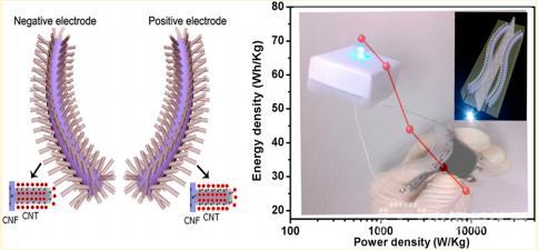 中國(guó)科學(xué)院蘇州納米技術(shù)與納米仿生研究所國(guó)際實(shí)驗(yàn)室張躍鋼團(tuán)隊(duì)近期結(jié)合靜電紡絲技術(shù)和高溫?zé)峤饧夹g(shù),制備在一維碳纖維上生長(zhǎng)垂直碳管的三維多級(jí)結(jié)構(gòu),并對(duì)其電化學(xué)性能進(jìn)行研究。在碳纖維上生長(zhǎng)垂直碳納米管陣列,提高了碳纖維的比表面積、導(dǎo)電性、多孔性以及電解液的浸潤(rùn)性,同時(shí)利用離子液3體電解液代替?zhèn)鹘y(tǒng)的水系電解液將其輸出電壓擴(kuò)展到4V,有效提高了柔性電容器的能量輸出。以離子液體為電解液所組成的柔性電容器在30°C,電流密度為0.5A/g的條件下,其比容量達(dá)到70.7 Wh/kg, 在60°C,電流密度為1A/g的條件下,其比容量達(dá)到98.8 Wh/kg。用該材料組裝的柔性電容器也表現(xiàn)出超高的循環(huán)穩(wěn)定性,在充放電循環(huán)20000次后,其容量保持率為97%。該三維柔性碳電極材料的優(yōu)異性能得益于,利用垂直碳管類儲(chǔ)存和積累電荷,而碳纖維導(dǎo)電基底運(yùn)輸電荷形成一個(gè)三維導(dǎo)電網(wǎng)絡(luò),極大地促進(jìn)電子和離子的移動(dòng)速度,減少材料本身電阻。相關(guān)成果已作為封面文章發(fā)表在Chemistry of Materials(DOI: 10.1021/cm 503784x)雜志上。