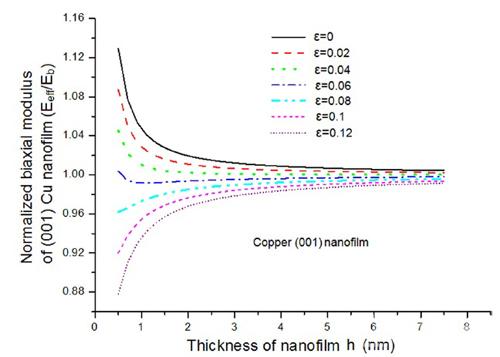 圖2:Cu納米薄膜雙軸拉伸等效模量隨薄膜厚度及外載應(yīng)變的變化 (據(jù):中國(guó)科學(xué)院)