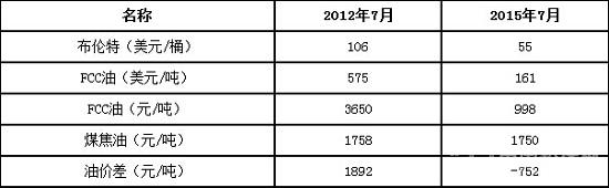 目前國(guó)內(nèi)的炭黑原料油主要是煤焦油配以蒽油、乙烯焦油等深加工油,而國(guó)外炭黑生產(chǎn)主要以FCC油為主,自去年2014年以來(lái),隨著國(guó)際原油價(jià)格的持續(xù)低位,F(xiàn)CC油價(jià)格較國(guó)內(nèi)煤焦油優(yōu)勢(shì)明顯,表2顯示,在當(dāng)前布倫特原油價(jià)格在55美元/桶的形勢(shì)下,F(xiàn)CC油與國(guó)內(nèi)煤焦油仍存在752元/噸的價(jià)差,明顯低于2012年的價(jià)格水平。
