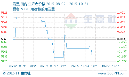 從炭黑價(jià)格走勢圖不難看出,炭黑整體走勢是穩(wěn)中有小幅震蕩。十月本該是炭黑的銷售旺季,但整個月下來并未出現(xiàn)拉動炭黑行情走高的利好因素,反而是上游高溫煤焦油持續(xù)弱勢,價(jià)格處于歷史低位,降低了炭黑成本;下游對炭黑的需求疲軟不振;近年來我國炭黑產(chǎn)量不斷增加。這些都無疑對炭黑行情產(chǎn)生了一定的打壓。目前炭黑行情能夠穩(wěn)定已是不錯,華東地區(qū)N220報(bào)價(jià)5400-5850元/噸,華北地區(qū)N220報(bào)價(jià)4200-5600元/噸,華南地區(qū)N220報(bào)價(jià)5150元/噸,華中地區(qū)N220報(bào)價(jià)5000元/噸。