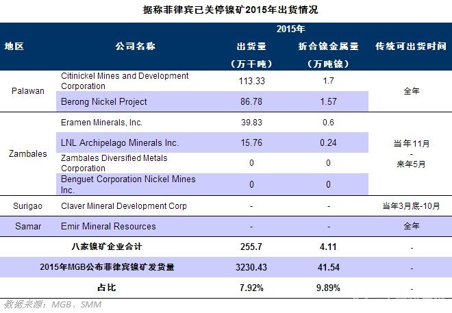 據(jù)菲律賓礦務(wù)局(Mines and Geosciences Bureau,MGB)官方統(tǒng)計(jì),2015年在冊(cè)鎳礦山27座,其中南蘇里高省的Claver Mineral Development Corp和Emir Mineral Resources不在其列,其余六家鎳礦企業(yè)都位列其中,SMM了解Claver Mineral Development Corp 2015年并未出貨,結(jié)合MGB數(shù)據(jù),這8家礦企2015年合計(jì)出貨量在255.70萬干噸,占到菲律賓總出貨量的7.92%,折合鎳金屬量4.11萬噸,占總量的9.89%。