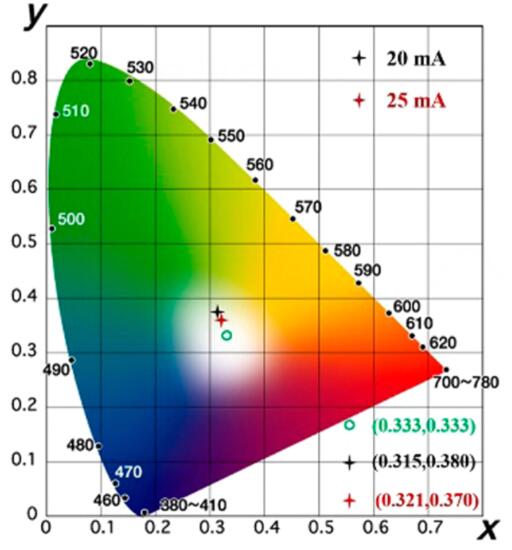 測試結(jié)果表明,作為發(fā)光器件,其光線的顯示范圍非常接近于自然光(圖中綠色點(diǎn)),作為半導(dǎo)體器件,其穩(wěn)定性也較好,在測試的兩個月期間,幾乎沒有性能下降。