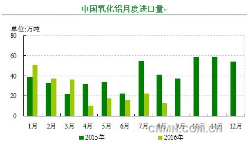 在氧化鋁需求隨著電解鋁產(chǎn)量穩(wěn)步增加的情況下,國(guó)內(nèi)氧化鋁進(jìn)口量卻出現(xiàn)下滑,導(dǎo)致國(guó)內(nèi)氧化鋁市場(chǎng)出現(xiàn)供不應(yīng)求現(xiàn)象。由于今年前半年國(guó)產(chǎn)氧化鋁價(jià)格一直處于低位,進(jìn)口氧化鋁沒(méi)有價(jià)格優(yōu)勢(shì),整體今年的進(jìn)口量和長(zhǎng)單計(jì)劃量均處于偏低狀態(tài),整體進(jìn)口持續(xù)處于偏低水平。海關(guān)數(shù)據(jù)數(shù)據(jù)顯示8月中國(guó)進(jìn)口氧化鋁12.87萬(wàn)噸,環(huán)比減少41.5%,同行比減少68.3%。進(jìn)口貨源有限,導(dǎo)致國(guó)內(nèi)氧化鋁市場(chǎng)流通貨源明顯縮緊。