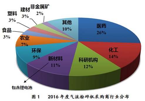 通過(guò)對(duì)2016全年氣流粉碎機(jī)專場(chǎng)用戶數(shù)據(jù)統(tǒng)計(jì)分析發(fā)現(xiàn),氣流粉碎機(jī)在醫(yī)藥、化工、科研機(jī)構(gòu)、新材料行業(yè)受到持續(xù)關(guān)注,采購(gòu)需求一直熱度不減。此外,氣流粉碎機(jī)也更多地走進(jìn)環(huán)保、農(nóng)業(yè)領(lǐng)域。