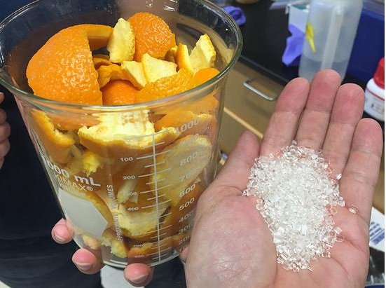 橙皮也有妙用。康奈爾大學(xué)的研究團(tuán)隊(duì)嘗試從橙皮油中提取檸檬烯碳基化合物來(lái)制造塑料。