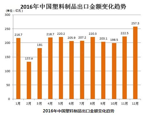 2016年中國(guó)出口塑料制品1038萬(wàn)噸,同比增長(zhǎng)6.7%;出口金額為2351.7億元,同比增長(zhǎng)0.5%。12月當(dāng)月出口100萬(wàn)噸,環(huán)比增長(zhǎng)5.3%;出口金額為257.3億元,環(huán)比增長(zhǎng)15.6%。