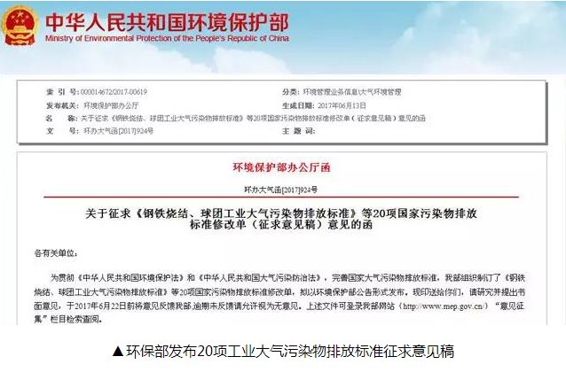 根據(jù)環(huán)保部發(fā)布公告顯示,《鋼鐵燒結(jié)、球團工業(yè)大氣污染物排放標準》等20項國家污染物排放標準修改單,征求意見時間為2017年6月22日前,逾期視為無意見,將由國務院環(huán)境保護主管部門或省級人民政府規(guī)定執(zhí)行該修訂單標準的地域范圍、時間。