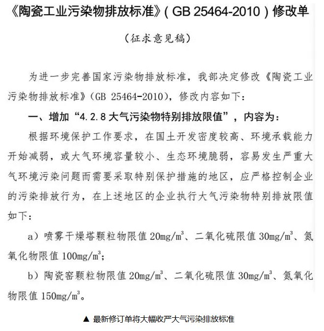 根據(jù)此次環(huán)保部公布的《陶瓷工業(yè)污染物排放標準》(GB 25464-2010)修訂單(征求意見稿)(以下簡稱“最新修訂單”)顯示,陶瓷工業(yè)大氣污染物排放標準主要作出兩方面修改:大幅收嚴大氣污染物排放標準;增加無組織排放控制措施。