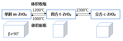 由于在單斜相向四方相轉(zhuǎn)變的時(shí)候會(huì)產(chǎn)生較大的體積變化,冷卻的時(shí)候又會(huì)向相反的方向發(fā)生較大的體積變化,容易造成產(chǎn)品的開(kāi)裂,限制了純氧化鋯在高溫領(lǐng)域的應(yīng)用。