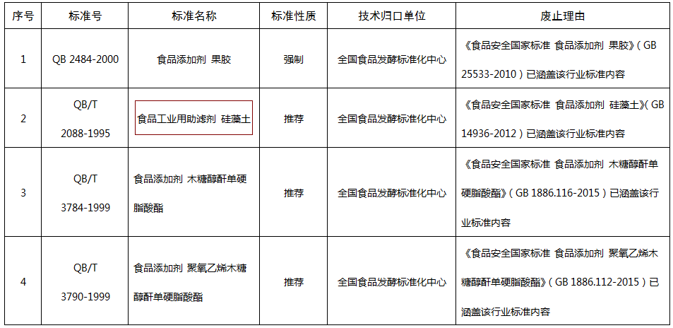 《食品工業(yè)用助濾劑 硅藻土》(QB/T 2088-1995)擬廢止的理由是《食品安全國(guó)家標(biāo)準(zhǔn) 食品添加劑 硅藻土》(GB 14936-2012)已涵蓋該行業(yè)標(biāo)準(zhǔn)內(nèi)容。
