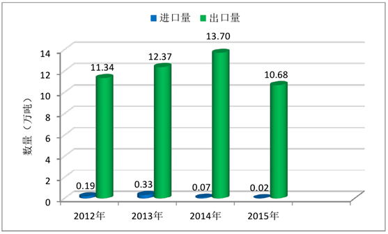 2012-2015年中國鱗片天然石墨進(jìn)出口數(shù)量圖