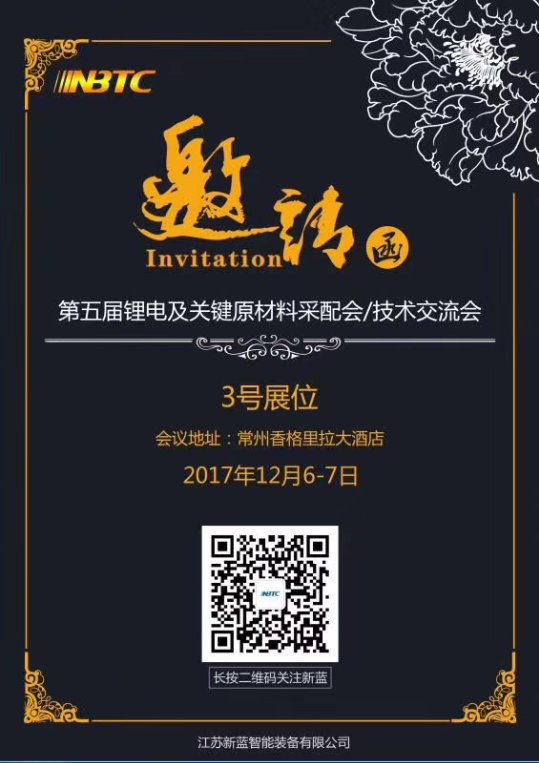 2017第五屆鋰電及關(guān)鍵原材料采配會/技術(shù)交流會將于12月5-7日在動力電池行業(yè)的新基地--常州召開。鋰電材料智慧工廠整體解決方案服務(wù)商—江蘇新藍智能裝備股份有限公司與您相約龍城常州,共話鋰電行業(yè)未來。