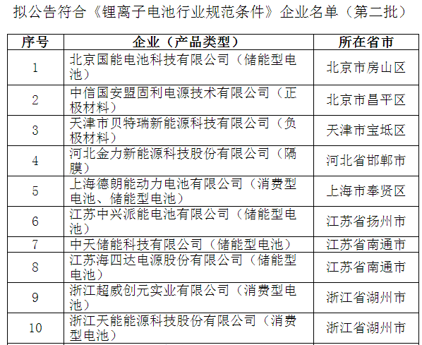 中國粉體網(wǎng)訊 根據(jù)《鋰離子電池行業(yè)規(guī)范條件》(工業(yè)和信息化部公告2015年第57號)及《鋰離子電池行業(yè)規(guī)范公告管理暫行辦法》(工信部電子〔2015〕452號),經(jīng)組織申報(bào)、專家評審及現(xiàn)場核實(shí)等程序,現(xiàn)將擬公告符合《鋰離子電池行業(yè)規(guī)范條件》企業(yè)名單(第二批)予以公示。其中,北京國能、中航鋰電、中天儲能等18家企業(yè)入選。