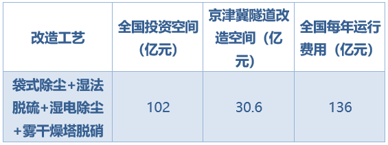 根據(jù)《陶瓷工業(yè)污染物排放標(biāo)準(zhǔn)》(GB25464-2010)修改單(征求意見稿)編制說明,陶瓷生產(chǎn)企業(yè)需要投入袋式除塵、濕法脫硫、濕電除塵、噴霧干燥塔脫硝等,一條陶瓷生產(chǎn)線的大氣污染治理設(shè)施投資在600萬元以上,每年的運(yùn)行維護(hù)費(fèi)用約400萬元。全國的投資市場(chǎng)為204億元,假設(shè)改造的成本是新建投資的50%,京津冀的生產(chǎn)線占全國的比例約為30%,則全國的改造空間為102億元,京津冀改造市場(chǎng)為30.6億元,如果陶瓷生產(chǎn)線全面運(yùn)行,每年費(fèi)用將達(dá)到136億元。