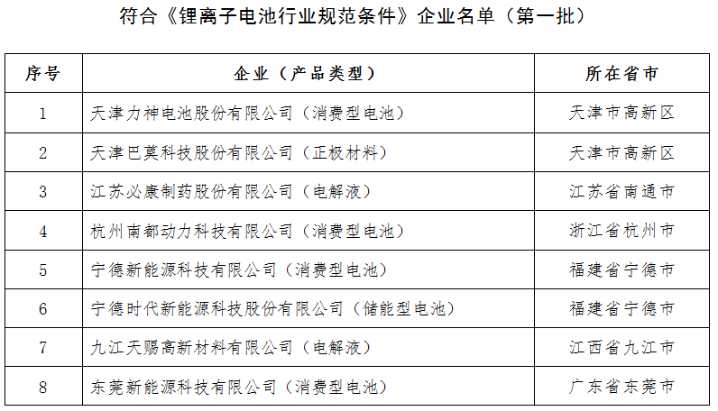 2017年4月17日,工信部公布了符合《鋰離子電池行業(yè)規(guī)范條件》企業(yè)名單(第一批),8家企業(yè)入選。其中,寧德時(shí)代新能源科技股份有限公司作為唯一的儲(chǔ)能型電池企業(yè)入選。