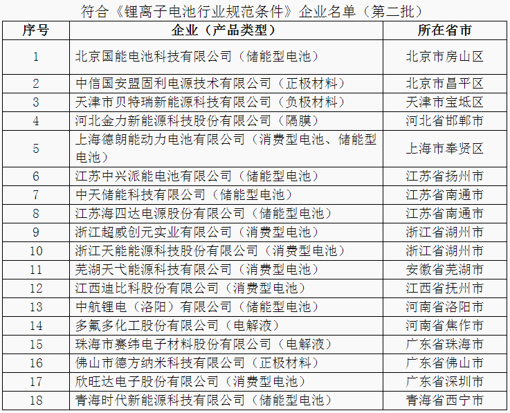 中國粉體網(wǎng)訊 1月15日,工信部公布符合《鋰離子電池行業(yè)規(guī)范條件》的企業(yè)名單(第二批),多氟多、欣旺達(dá)、國能電池、盟固利動(dòng)力、中興派能、中航鋰電等18家鋰電企業(yè)進(jìn)入名單。