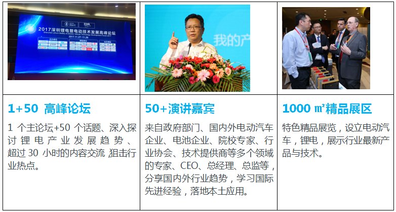 深圳國(guó)際鋰電暨電動(dòng)技術(shù)發(fā)展高峰論壇,是目前國(guó)內(nèi)領(lǐng)先的的鋰電池及電動(dòng)汽車技術(shù)發(fā)展論壇。主要專注于:動(dòng)力鋰電,儲(chǔ)能鋰電,和電動(dòng)汽車技術(shù)。 2017年11月27在深圳舉辦。共來(lái)自全國(guó)32位鋰電及電動(dòng)汽車專家與企業(yè)家出席演講,同時(shí)聽(tīng)眾出席人數(shù)超過(guò)500位,其中包括國(guó)際知名的鋰電池與電動(dòng)汽車,電動(dòng)工具制造商、和材料設(shè)備公司。如長(zhǎng)城汽車、沃爾沃汽車、蔚來(lái)汽車、比亞迪、北汽新能源、奇瑞新能源、江淮新能源、上汽新能源、銀隆新能源、車和家、長(zhǎng)江EV 、知豆、眾泰新能源、南京金龍、小鵬汽車、寧德時(shí)代、ATL、國(guó)軒高科、萬(wàn)向123、卡耐新能源、中航鋰電、德朗能、中興派能、天津力神、比克電池、微宏動(dòng)力、星恒電源、海四達(dá)、天鵬電源、沃特瑪、天勁新能源、億緯鋰能、猛獅科技、欣旺達(dá)、惠州德賽、南都電源、貝特瑞、杉杉科技、星源材質(zhì)、中科科技、滄洲明珠、天齊鋰業(yè)、贛鋒鋰業(yè)、當(dāng)升科技、TCL、海爾、小米、大疆、億航、聯(lián)想、羅馬仕、飛利浦、飛毛腿、LG、3M、博世光等。共有來(lái)自多個(gè)國(guó)家和地區(qū)超過(guò)500多位專業(yè)人士出席本次論壇。據(jù)主辦方統(tǒng)計(jì)60%現(xiàn)場(chǎng)聽(tīng)眾與演講嘉賓有深入交流與合作。