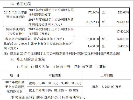 今日,天際股份修正2017年度盈利1400萬(wàn)元-3400萬(wàn)元,同比下降81.82%-55.85%。此前,第三季度報(bào)告中預(yù)計(jì)2017年度盈利20792.43萬(wàn)元-24642.88萬(wàn)元,同比增長(zhǎng)170%-220%。