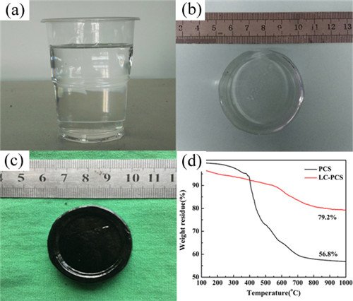 圖1(a)LC-PCS;(b)交聯(lián)固化產(chǎn)物;(c)1200℃裂解產(chǎn)物;(d)PCS和LC-PCS的TG曲線
