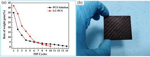 圖2(a)LC-PCS和PCS溶液浸漬周期-增重曲線;(b)LC-PCS為先驅(qū)體所制得2D Cf/SiOC