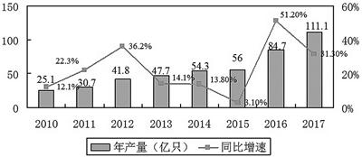 2010—2017年我國(guó)鋰離子電池產(chǎn)量和同比增速 數(shù)據(jù)來(lái)源:國(guó)家統(tǒng)計(jì)局,賽迪智庫(kù),2018.04