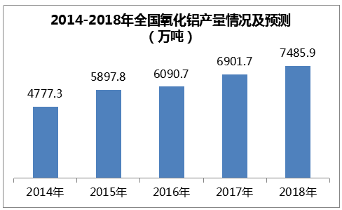 2017年中國氧化鋁累計產(chǎn)量為6901.7萬噸,累計增長7.9%。據(jù)中商產(chǎn)業(yè)研究院數(shù)據(jù)預(yù)測,預(yù)計2018年中國氧化鋁累計產(chǎn)量達7485.9萬噸,累計增長約8.9%。