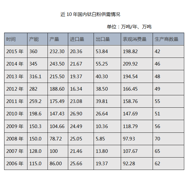 截至2009年底,全球鈦白粉總產(chǎn)能為570萬(wàn)噸/年,國(guó)外的鈦白粉發(fā)展較慢,平均每年增幅為3%—5%。2010年全球多家鈦白粉廠被關(guān)停,其中,美國(guó)關(guān)閉了3家,西歐關(guān)閉了3家,東歐關(guān)閉了2家。而2009—2011年間,國(guó)內(nèi)鈦白粉產(chǎn)以每年30%的增長(zhǎng)幅度快速?gòu)浹a(bǔ)了上述缺口,2013年國(guó)內(nèi)產(chǎn)能一舉突破300萬(wàn)噸/年大關(guān)。2013年以后,產(chǎn)能增幅開(kāi)始減緩,2014年增幅降至9.2%,2015年降至4.3%,產(chǎn)能增幅已逐步回歸到與經(jīng)濟(jì)增長(zhǎng)相適應(yīng)的水平 。