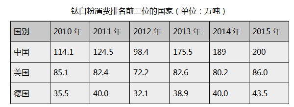 由此可知,目前中國(guó)已經(jīng)成為全球第一大鈦白粉消費(fèi)國(guó)。2013年,我國(guó)國(guó)內(nèi)鈦白粉需求總量約175. 5萬(wàn)噸。2015年,國(guó)內(nèi)鈦白粉需求總量約200萬(wàn)噸,年均增長(zhǎng)率8. 4%,預(yù)計(jì)未來(lái)仍有較大的增長(zhǎng)空間。