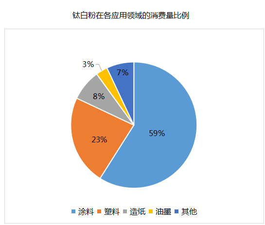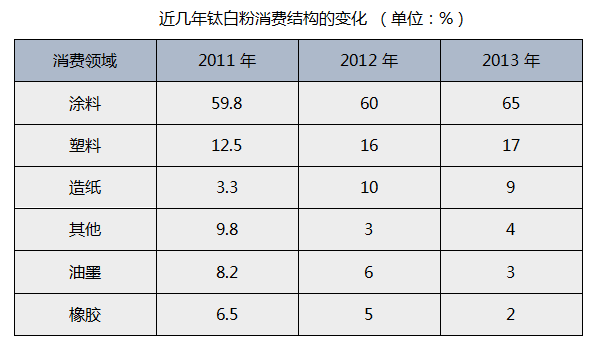 近幾年,鈦白粉的消費(fèi)結(jié)構(gòu)在發(fā)生變化,在涂料和塑料中的占比提高,造紙行業(yè)也有所增長(zhǎng),涂料、塑料和造紙仍是鈦白粉消費(fèi)的三大主力。近幾年來(lái),受歐洲綠色壁壘和美國(guó)反傾銷影響,國(guó)內(nèi)輪胎出口受阻,鈦白粉在橡膠領(lǐng)域用量大幅度降低。