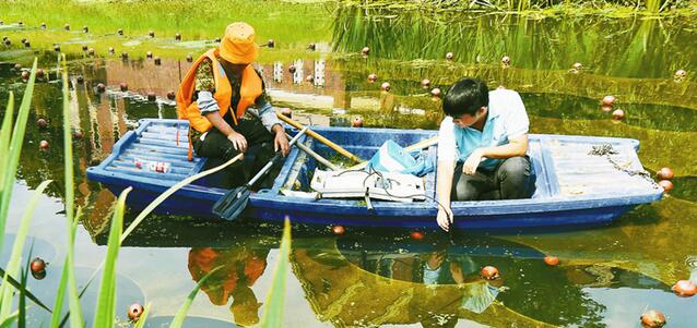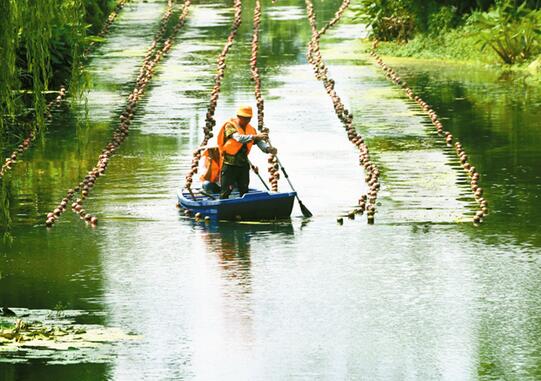 工作人員在水渠鋪設(shè)石墨烯光催化網(wǎng),用于改善水環(huán)境。