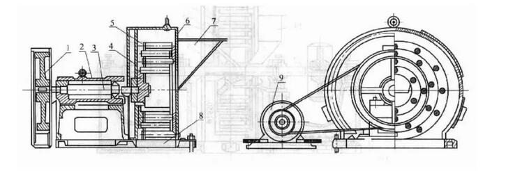 6—機(jī)殼;7—加料口;8—排料口;9—電動機(jī)