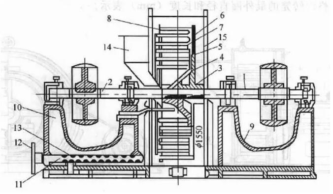 1,2—心軸;3,4—輪轂;5,6—圓盤;7—鋼棒;8—鋼環(huán);9,10—軸承座;11—螺桿;12—手輪;13—螺帽;14—加料口;15—機(jī)殼