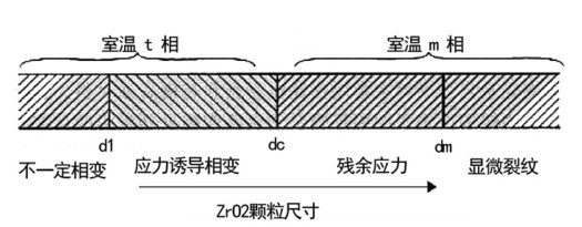 因此,四方相氧化鋯含量和可相變的四方氧化鋯含量是影響材料增韌效果的決定因素,除此以外,穩(wěn)定劑的含量、氧化鋯晶粒尺寸以及燒結(jié)溫度等都影響著氧化鋯相變?cè)鲰g的效果。