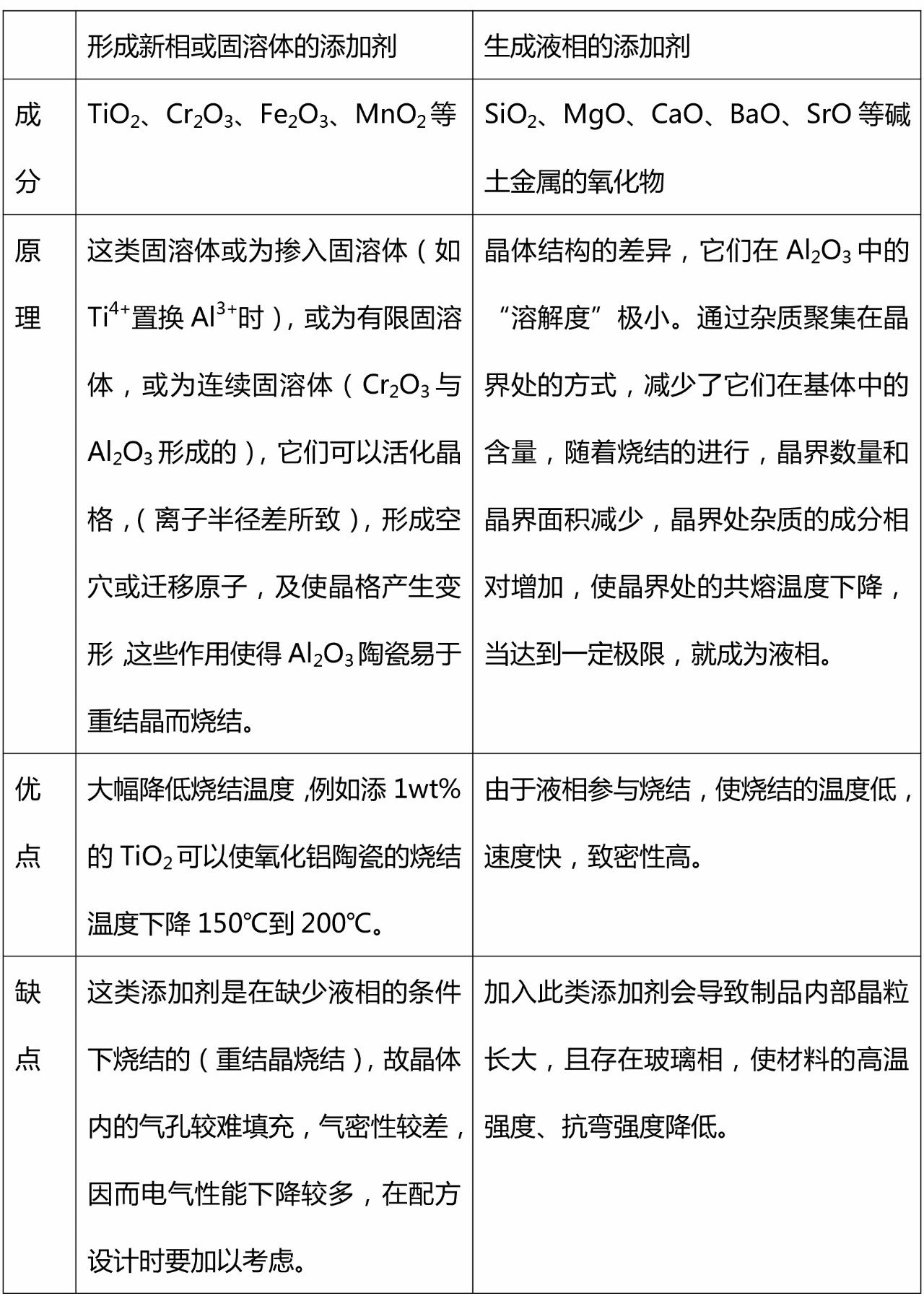在氧化鋁陶瓷的生產(chǎn)過程中常常會添加燒結(jié)助劑,通過改變配方設(shè)計來降低氧化鋁陶瓷的燒結(jié)溫度。根據(jù)其促進氧化鋁陶瓷燒結(jié)的作用機理不同,可以將它們分為形成新相或固溶體的添加劑和生成液相的添加劑二大類。